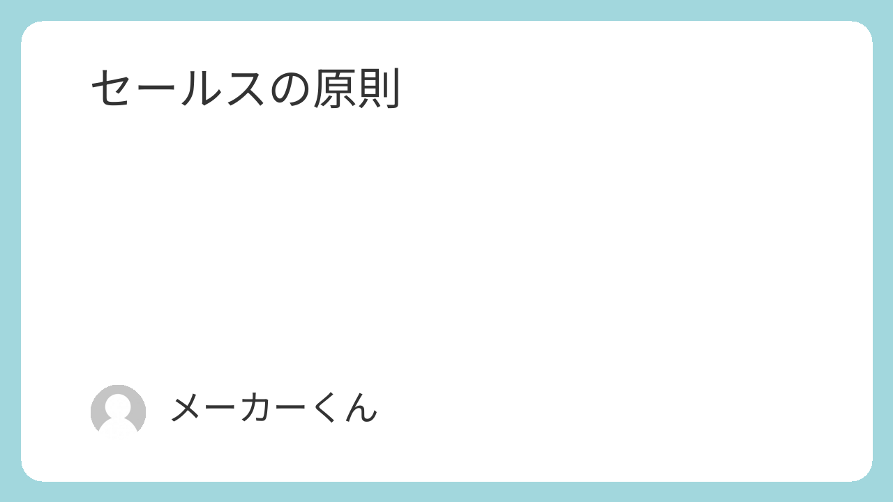 セールスの原則 セールス X Facebook はてブ LINE コピー 2025.11.14 提案のスタートは必ず医師の悩み、問題、イシューからを徹底する。そこから解決策の提案をし、その延長線上に製品を置く。この構図を守ること。営業の考えとしては、診療科→問題→製品の順番となる。
